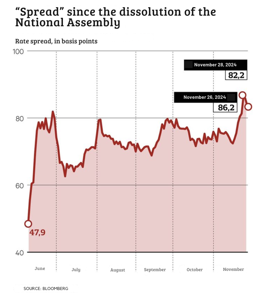 One of the most widely followed indicators of France’s economic health is its government bonds (obligations assimilables du Trésor or OATs): the yield reflects market confidence in France’s creditworthiness and economic conditions, with rising yields often signaling increased risk perceived by investors. Additionally, the spread between OAT yields and German Bunds serves as a benchmark for comparing investor sentiment toward France versus Europe’s strongest economy. In the past few months, the French bond market has spiked to political uncertainty. As a result, the spread between French and German 10-year bond (which represents a key risk gauge) spiked to 89 basis points in late November 2024. It is the highest since eurozone crisis days in 2012, and up from the 55 basis points in May 2024 before parliamentary dissolution.